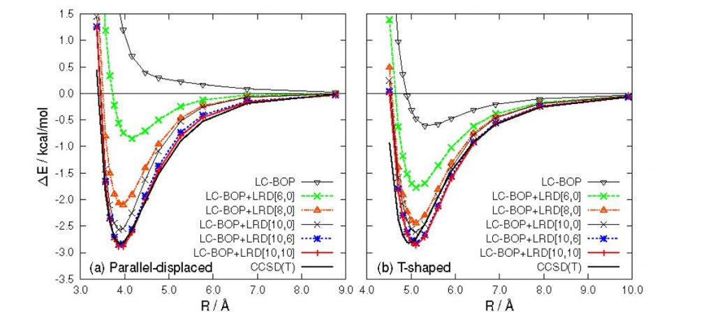 LRD法は、電子密度に依存した分散力補正エネルギーを見積ることができるので、閉殻系の基底状態だけでなく、開殻系や励起状態にも適用できる。さらに、Gauss基底を用いる量子化学計算だけでなく、平面波基底を用いる第一原理計算にも用いることができる。LRD法はアイオワ州立大学のMark Gordon研究室で開発されているデファクトスタンダード量子化学計算パッケージGAMESSに実装されており、誰でも利用することが可能である。