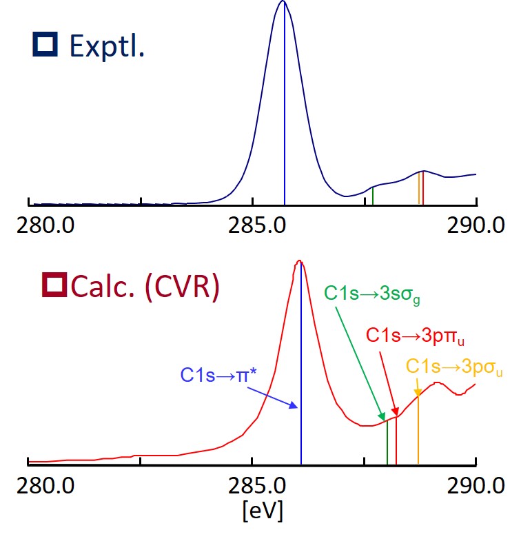 電子励起状態を計算するための理論として、時間依存密度汎関数理論(TDDFT)がしばしば用いられるが、その計算精度は用いる交換相関汎関数に依存する。価電子励起エネルギーに関しては、B3LYPなどの一般的な汎関数を用いても実験値を比較的よく再現することができるが、電荷移動型の励起状態やRydberg励起状態では、自己相互作用誤差(SIE)を補正できる長距離補正(LC)型の汎関数が必要である。中井研究室では、系統的な数値検証からLDA, GGA, ハイブリッド汎関数いずれを用いても内殻励起エネルギーが過小評価されることを明らかにした。そして、この過小評価を改善するには短距離的なSIEを補正する必要があることを明らかにし、その考察に基づくCore-Valence-Rydberg(CVR)汎関数を提案した。実際、CVR汎関数を用いることでエチレンの内殻励起スペクトルを良好に計算することができた(図 1-C-2)。