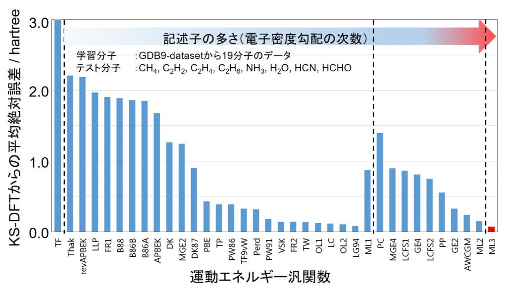 Kohn-Sham(KS)法のように軌道を導入せずに、電子密度のみの情報からDFT計算を行うには、運動エネルギー汎関数(KEF)の開発が不可欠である。しかし、運動エネルギー項は、交換項や相関項に比べて値が大きいため、それを近似した場合の誤差も必然的に大きくなる。Thomas-Fermi汎関数以降、90年にも及ぶ改良が試みられてきたが、未だに実用的な汎関数には到達していない。中井研究室では、密度や密度勾配などを記述子として、KS法の運動エネルギー密度を目的関数としたML型運動エネルギー汎関数(ML-KEF)を開発した(図 1-C-3)。3次微分まで加えることにより、従来のどの運動エネルギー汎関数より高精度な結果を与えることを確認した(図 1-C-4)。