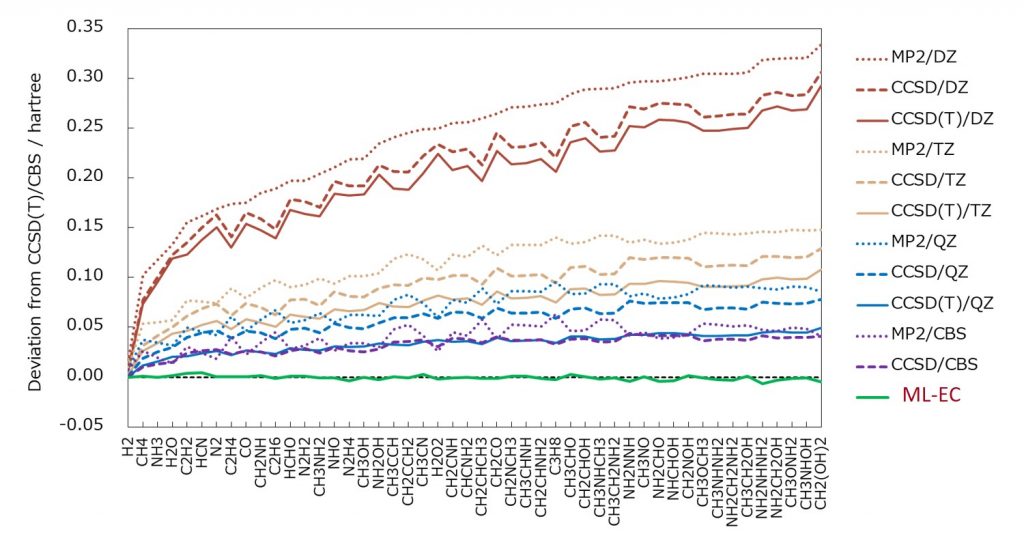 ML-KEFの成功により、Grid-to-Grid型の機械学習モデルの有効性を確証した。そこで、電子相関エネルギーに対しても同様のアプローチを検討した。記述子には、電子密度、密度勾配、運動エネルギー密度、HF交換エネルギー密度、非整数占有数の電子密度を用いた。Perdew教授が汎関数の階層を表現するために用いたヤコブの縄梯子(Jacob’s Ladder)において、これらの記述子はそれぞれRunge 1, 2, 3, 4, 5に対応する。目的関数は、CCSD(T)/CBS相関エネルギー密度とした。中井研究室では、CCSD(T)/CBS相関エネルギーをMP2/V(DTQ)Z, CCSD/V(DT)Z, CCSD(T)/VDZの相関エネルギーから見積る複合法を提案していた。また、量子化学得計算により得られるエネルギーを空間グリッドごとのエネルギー密度に分割する手法(Grid-EDA)も提案していた。これらの独自技術を用いて、CCSD(T)/CBS相関エネルギー密度を見積った。ML-KEFと同様にニューラルネットワークを用いて、上記の記述子、目的関数から機械学習型電子相関(ML-EC)モデルを構築した。15分子のトレーニングセット、33分子のテストセットを用いたML-ECモデルは、CCSD(T)/CBS相関エネルギーを非常によく再現することが確認された(図 1-C-5)。また、CCSD(T)/CBS相関エネルギーを見積る外挿法や複合法などの従来法に比べて、圧倒的に計算時間が短いことも確認された(図 1-C-6)。