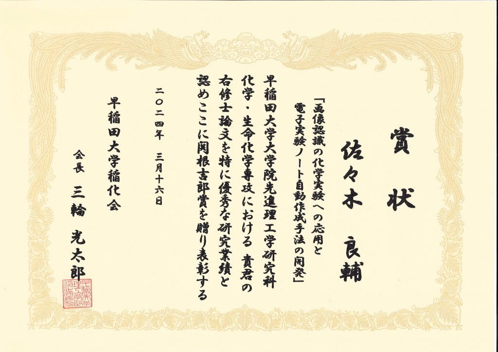 佐々木良輔(M2)が優れた修士論文に贈られる関根吉郎賞(2023年度)を受賞しました。