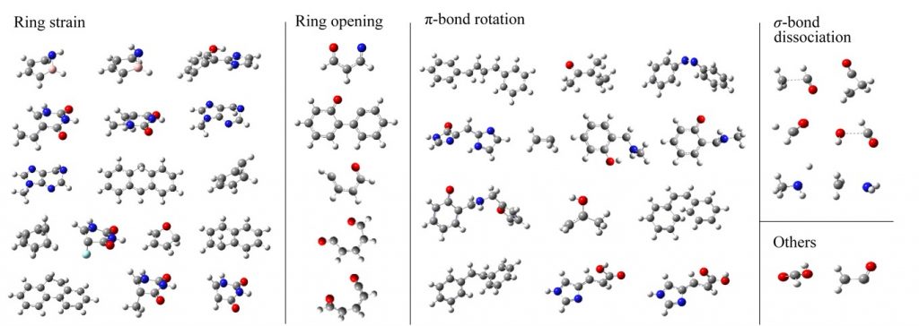 中井研究室では、凍結軌道解析(FZOA)による解析から、S0/S1 MECIではHOMOとLUMOの間の交換積分がゼロに近づくことを明らかにした(図2-C-2)。一般に軌道の重なりが小さくなると、交換積分はゼロに近づくので、S0/S1 MECIではHOMOとLUMOが空間的に重ならない構造となる。環歪み、開環、π結合回転、σ解離はいずれもこれを満たしている。